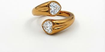 A modern open ring featuring two heart-shaped cubic zirconia accents set into a smooth, sculpted silhouette finished in 18K gold plating. Crafted from stainless steel, this waterproof and hypoallergenic style is lightweight and comfortable for everyday wear.