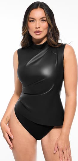 This faux leather bodysuit combines shaping and style with waist-sculpting mesh, a built-in bra, and a sleek mock neckline for effortless day-to-night elegance.