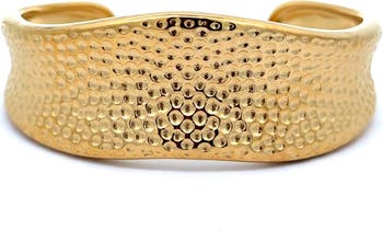 Make a bold statement with this sculptural cuff bangle designed with a wide polished silhouette. Crafted from stainless steel with 18k PVD gold plating it is waterproof and hypoallergenic for comfortable everyday wear. The substantial design adds a modern touch whether worn alone or stacked with other bracelets.