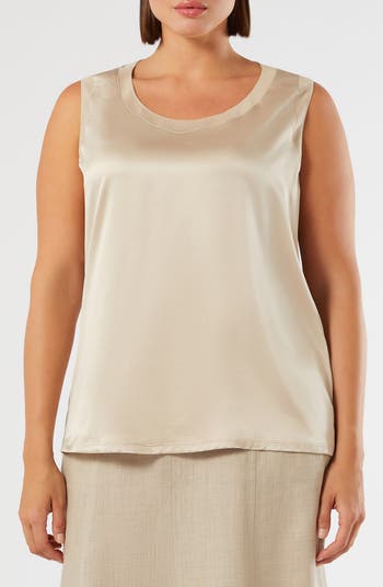 Luxurious satin enriches front this sleeveless jersey shell cut in a fluid, straight silhouette that looks great on its own or layered.
