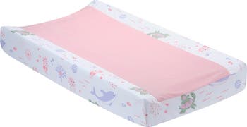 A soft luxurious pink minky center is perfect for changing your little one. The side panels are cotton featuring dolphins, sea turtles, jellyfish, sea horses, small fishes, and coral. There are buttonholes for the changing pad straps so your little one is safe and secure while getting their diaper changed. There is elastic on the short sides in order to fit securely on a standard size changing pad. It is machine washable and dryable for easy care.