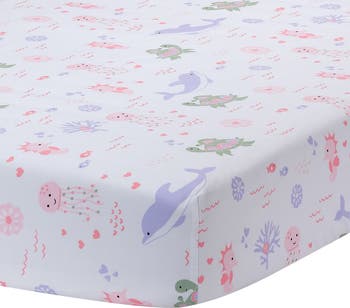 Your child will have a dreamy night’s sleep on this nautical, ocean themed breathable 100% cotton fitted crib sheet featuring dolphins, sea turtles, jellyfish, sea horses, small fishes, and coral. It has elastic all the way around ensuring a safe and secure fit on a standard sized crib mattress measuring 28” X 52”. It is machine washable and dryable for easy care.