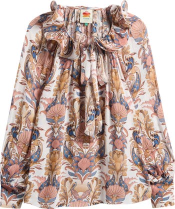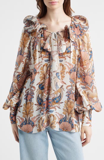 An utterly exquisite pattern provides captivating charm to a balloon-sleeve top accented with a wired ruffle flouncing the neckline.
