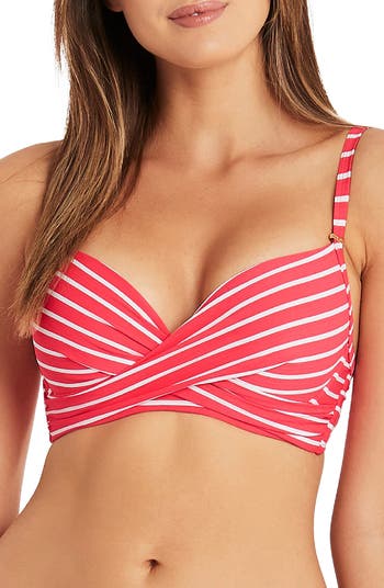 Sweet, sultry and supportive, this striped swim top flatters with a gathered crossover front and convertible straps.