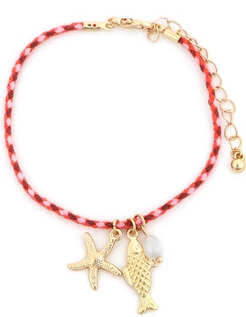 Accessorize your tropical vacation looks with a braided bracelet dangled with a pair of sea creatures and a single genuine pearl.