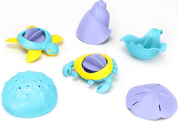 GREEN TOYS: SEA LIFE SET - 6 PIECE BATH SET - The perfect companion to our Tide Pool Set for water table and bathtub play! The 6-piece Green Toys: Sea Life Set includes a manta, sand dollar, urchin, and snail, as well as two critter spinners – the adorable tri-color turtle and crab. Made from 100% recycled plastic, each of the six shells and creatures in the set are specially designed to interact with and pour water in a different way. Fill up the urchin and watch the water strain out, or hold on to the manta tail and stream water out of the spouts on either side. The palm-sized shells are the perfect size for scooping and pouring water to wash little ones in infant tubs, while the whole set is also great for the beach and backyard. All the pieces are dishwasher safe and contain no BPA, phthalates, or PVC. Color combinations may vary. Packaged with recycled and recyclable materials printed with eco-friendly inks. For ages 6 months and up.