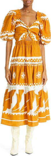 Trendy puff-sleeves frame this breezy linen-and-cotton midi dress featuring handy pockets, a flirty cutout and a tiered skirt.