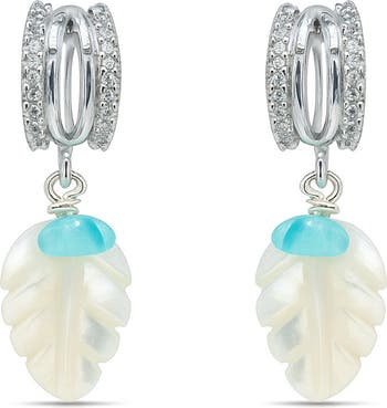 This gleaming pair of earrings evokes the dreamy ambiance of ocean air and frothy beaches with is blue amazonite stones and glowing mother-of-pear drops.