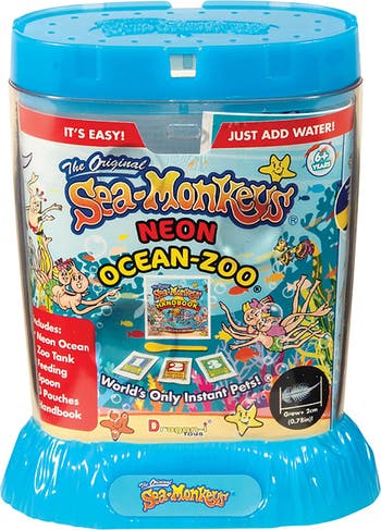 Now you can own Sea Monkeys! This kit includes all the essentials: a water purifier, instant live eggs, and growth food. They are the simplest pets to care for. The aquarium features a ventilated lid and a built-in magnifier. It's a classic set for creating your adorable aqua-pets, complete with a plastic aquarium that has a ventilated lid, built-in magnifiers, and a molded seascape bottom.