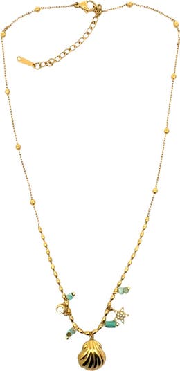 Add a playful coastal touch to your look with this sea shell and charms necklace. Crafted from stainless steel with 18k PVD gold plating it offers a polished finish that is waterproof and hypoallergenic for comfortable everyday wear. Designed with a 2 inch extender for an adjustable fit.
