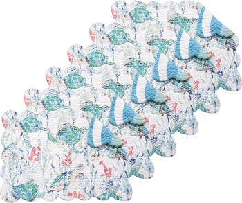 Bring a coastal touch to the dining room with the Sea Turtle Cove tabletop collection. Featuring turtles, fish, and coral, this quilted collection makes a statement in any ocean-inspired home. The colors featured are blue, green, and orange, perfect for creating a tranquil coastal atmosphere. The scallop-edge table linens a wavy line pattern in coordinating colors. Available as a napkin, placemat, round placemat, and runner. Love this pattern? Sea Turtle Cove is also available as a bedding collection.