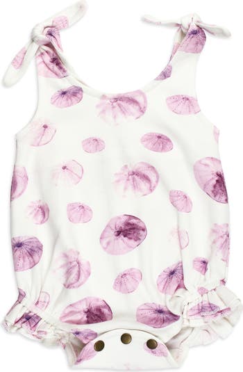 Watercolor sea urchins drift across a sweetly ruffed bodysuit fitted with tie straps and snaps between the legs for easy changes.
