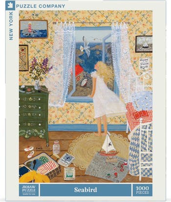 Transport yourself to a tranquil morning by the sea with the Seabird 1000 Piece Jigsaw Puzzle by celebrated artist Lore Pemberton. This beautifully intricate image captures a serene, contemplative moment as a young girl with flowing blonde hair gazes out her bedroom window, dreaming of a day at the shore. Dressed in a soft nightgown, she ponders what to pack for her seaside adventure. The room is filled with nautical charm sailing-inspired pictures adorn the walls, a model sailboat she has been crafting rests on the floor, and outside, a seabird soars over the rocky coastline.\r\n\r\nDiscover the peaceful beauty of seaside daydreams with the Seabird Jigsaw Puzzle. Perfect for those who appreciate intricate details and nautical themes, this puzzle offers a calming and immersive escape. Order now and bring this coastal masterpiece to life, one piece at a time!