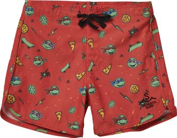 Cowabunga, dude—Leo, Raph, Don and Mickey bring the fun to these sustainable, kid-sized board shorts featuring scalloped hems and a retro flare fit.