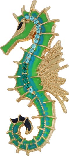 Add a whimsical touch with an enamel brooch shaped like a striking seahorse.