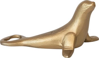 This Antique Gold Seal-shaped Bottle Opener is a delightful addition to any coastal, beach, or nautical-themed space. Crafted from aluminum, it combines a whimsical design with practical functionality. Perfect for opening bottles with ease, this charming accessory measures 5 inches in length, 3.25 inches in width, and 2.5 inches in height, making it both a decorative and useful tool for the bar or kitchen. The antique gold finish adds a touch of elegance, while the seal-shaped design brings a unique flair to any decor. Whether hosting a beach party or simply enjoying a drink at home, this bottle opener is sure to be a conversation starter and a useful tool for guests.