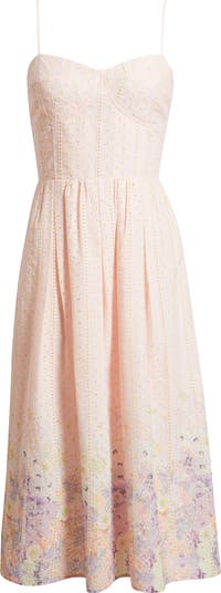 A seamed bodice offers a bustier-inspired look for this broderie-anglaise dress featuring a gradient floral print along the hem.