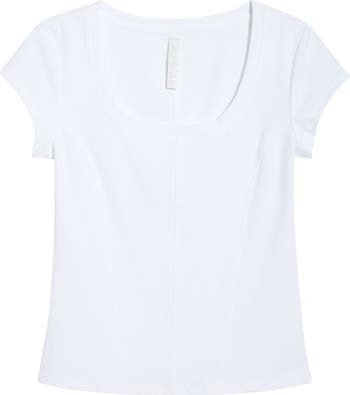 Fine allover ribbing and ample stretch enhance the close fit of this everyday scoop-neck top.
