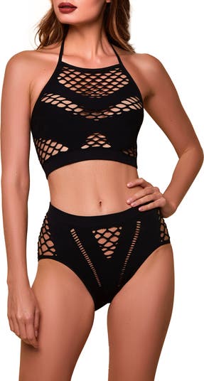 Sheer fishnet lace creates the ultimate seductive look on this seamless bralette and panties set crafted from stretchy fabric for lasting comfort.