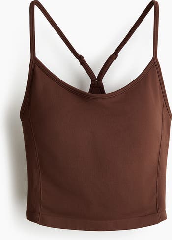 Sports top in functional fabric made with DryMove™, which helps pull moisture away from your skin, keeping you comfortably dry while moving. Deep neckline and lined cups with removable inserts for an adjustable fit and to shape the bust. Shoulder straps that meet at the back and elastication at the hem. The top is designed with the minimum number of seams for a more comfortable fit and increased mobility. Medium support suitable for moderate-intensity workouts.
