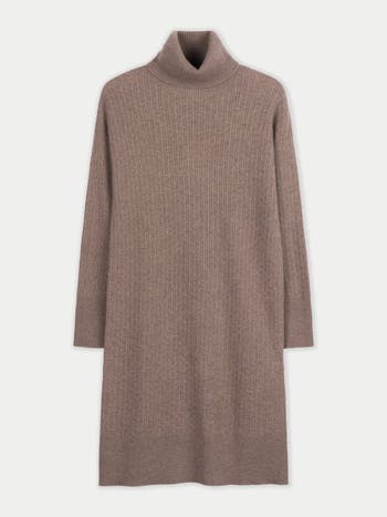 This seamless cashmere dress features a thick turtle neckline, knee-length cut, and ribbed cuffs and hem. Designed to provide warmth and comfort in cooler seasons, it highlights a simple yet elegant style. Layer it under a coat for an even more refined and sophisticated look.