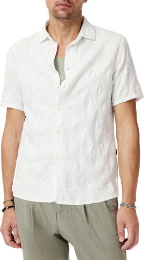 A breathable cotton-and-linen blend dials up your comfort in this short-sleeve shirt that's intriguingly textured with allover swirls and cut with a straight hem that looks great worn casually untucked.