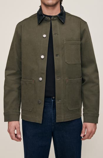 Sport a classic workwear look as the seasons change in this layer-ready shirt-jacket crafted with a boxy fit and a supple leather collar that gives this style a bit of textural depth and dimension.