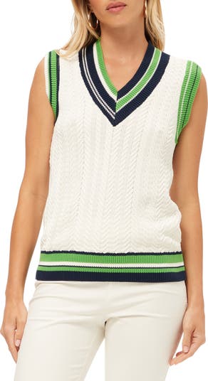 Cable knit V neck sweater vest with contrast trim