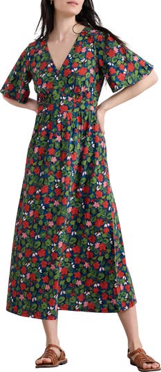 A vibrant floral dress cut from airy organic cotton features a midi silhouette that's framed by fluttery sleeves and fitted at the bodice then falls to a full skirt.