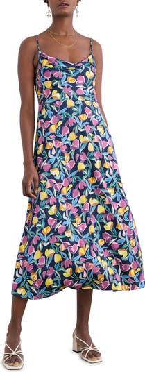 A softly draped cowl neck and empire waist shape an elegant midi dress crafted from smooth satin, patterned in pretty purple and yellow tulips.