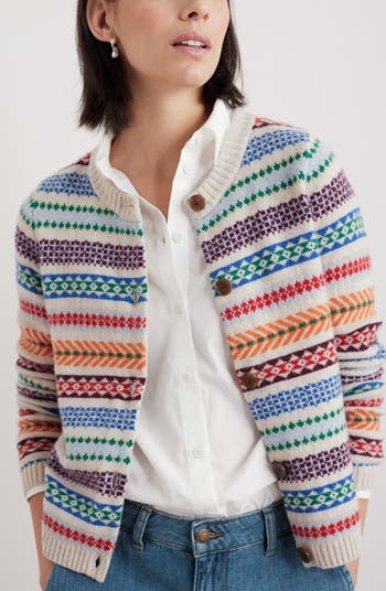 Infused with vibrant colors, this cardigan is knit from cozy merino-wool blend yarns in a Fair Isle pattern that's deeply intricate but neutral enough so it won't overwhelm your look.