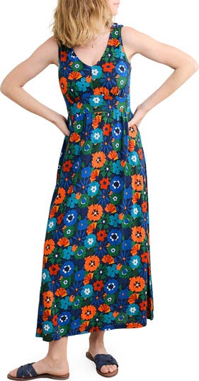 A retro floral print enlivens this slubbed-jersey dress cut from organic cotton in a maxi silhouette that's cinched at the bodice and balanced by a full skirt.