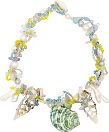 Seashell And Pearl Statement Necklace designed to elevate everyday style. Make a bold impression with this statement necklace featuring natural freshwater pearls paired with green seashells, quartz, agate, and amethyst accents. Designed and assembled in Los Angeles from imported parts.