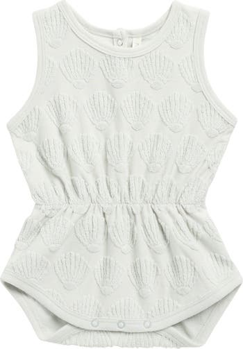 A textured-terry cloth shell motif is fun for little fingers to explore on a cotton-blend romper that's cinched at the waist for a bit of shaping.