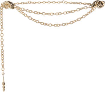 A two-layer chain belt adorned by three polished seashell accents and plated in gleaming 14-karat gold brings a glamorous touch to your looks.