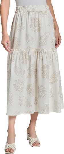 Take a summery stroll in this light and lovely linen-blend skirt covered in seashell print and fashioned with an easy drawstring waist and charming tiers.