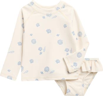 A superstretchy rashguard paired with matching bottoms in an adorable seashell print keeps your little beachcomber comfy and protected from the sun.