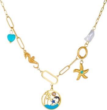 Elevate your style with this stunning gold-plated ocean-inspired necklace. Featuring a unique mix of sea-themed charms, including a dazzling starfish with a turquoise accent, a delicate seahorse, and a dreamy enamel beach pendant, this piece brings a touch of tropical elegance to any look. The fine craftsmanship and whimsical design make it perfect for everyday wear or special occasions. A beautiful blend of coastal charm and sophistication, this necklace also makes a thoughtful gift for ocean lovers.