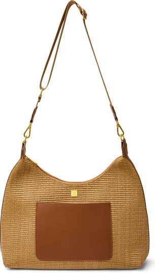 Smooth leather and finely woven raffia bring textural interplay to a spacious satchel featuring a pair of optional straps for convenient on-the-go styling.