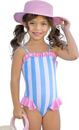Let her make a splash in the Seaside Stripes Ruffle Swimsuit, a charming one-piece perfect for sunny beach days. Featuring classic blue and white stripes with adorable pink side ruffles, this swimsuit brings a playful nautical vibe to her swimwear collection.The ruffled neckline adds a sweet, feminine touch, making it a stylish choice for poolside lounging or building sandcastles by the shore.