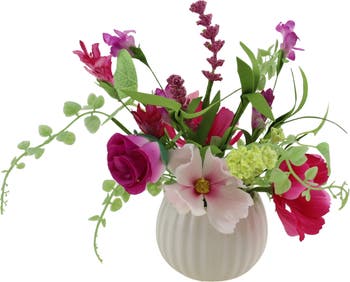 Seasons Designs presents an exquisite artificial flower arrangement in a white vase, featuring an 8-inch pink spring flower bowl. This beautiful tabletop piece is perfect for your living room, adding a touch of elegance and charm to your home decor. Ideal for enhancing your indoor space, this arrangement brings a vibrant spring feel to any room, making it a delightful addition to your home decoration.
