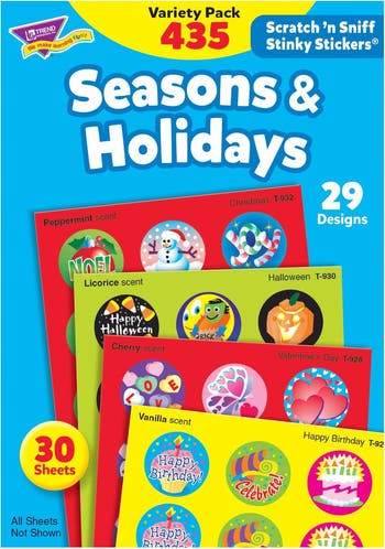 Scratch ’em and sniff ’em for a burst of fragrance! Everyone's favorite stickers, Stinky Stickers® are fun to collect or use to motivate and reward. Designs include Happy Birthday, Valentine's Day, Water Play, Halloween, Thanksgiving Time, and Christmas. Designs may vary. Acid free, nontoxic, and safe for use on photos. 29 designs, 435 stickers, 6 scents.