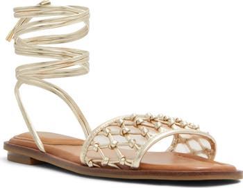 Playful knotted detailing charms the mesh strap of this boho-chic ankle-wrap sandal grounded on a cushy, lightweight footbed.