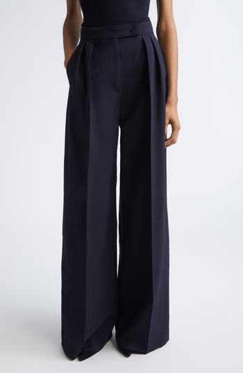 Double front pleats enhance the dramatic flare of the wide-cut legs on these high-waist pants tailored from richly textured wool-blend seersucker.