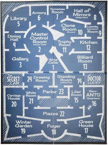 Kill Doctor Lucky has recently been re-released in a deluxe 19.5th Anniversary Edition. And another Cheapass classic, Before I Kill You, Mister Spy, was also re-released this year. This limited-edition expansion board, the Secret Lair of Doctor Lucky commemorates these two games. This board is compatible with all editions of Kill Doctor Lucky, but is specifically designed for use with the new 19.5th Edition rules. This tongue-in-cheek blueprint-style board has such notable rooms as the Hall of Mirrors, Master Control Room, Standing Room, and Servants Quarters (complete with ant). It's the perfect secret lair for the evil Doctor Lucky. This is an expansion board that requires the pawns, cards, and rules from Kill Doctor Lucky.