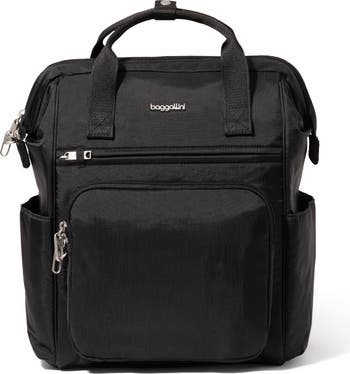 Love this. It’s easy to stay organized with all the pockets. I especially love the outside side pockets. They are expandable so can accommodate my 34 oz water bottle on one side and my travel purse on the other. It’s comfortable to wear while zipping through the airport with my wheeled bag in one hand. It has metal stabilizers built into the top, so it stays upright when the top is open. Also, super cute! I also purchased the Baggilini small crossbody in a matching fabric, which lives the side pocket of my backpack. Excellent system.