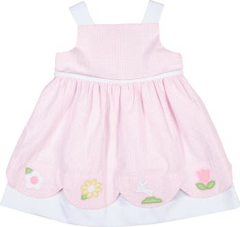 Sweet and storybook-perfect, this dress is crafted from pink and white check seersucker in soft, breathable 100% cotton—ideal for any spring celebration. Appliqué flowers and a playful bunny bring cheerful charm, while a scalloped hem adds a delicate finishing touch. Designed with a classic waist silhouette and a softly shirred skirt, it offers easy movement and comfort. A back zipper keeps dressing simple, and the knee-length hem makes it perfect for special warm-weather outings and picture-perfect spring moments.