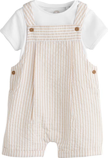 Cheery stripes pattern baby's first overalls made from cotton seersucker and offered with a snap-shoulder T-shirt for pairing with or wearing separately.