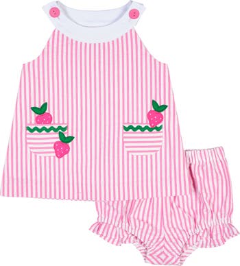 Sweet and full of summertime charm, this two-piece set is crafted from pink and white stripe seersucker in soft, breathable 100% cotton. Appliqué strawberries add a cheerful pop of color, complemented by playful patch pockets and green ric rac trim for a fresh, garden-inspired finish.\nThe dress falls above the knee with an easy, breezy silhouette, while the coordinating bloomer features elastic at the waist and ruffled legs for comfort and coverage. Perfect for warm-weather outings, vacations, and sunny days filled with play. A bright and breezy Cruise Collection favorite—made for sunshine, sweetness, and picture-perfect moments.