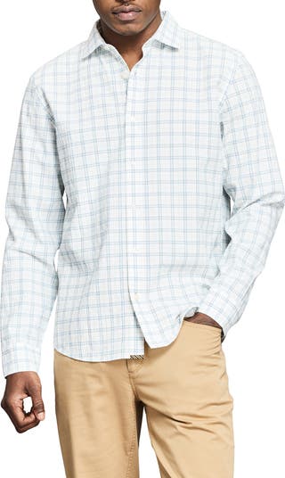 Lightly textured cotton seersucker woven in a crisp plaid brings sunny-day comfort to a shirt that's made with a touch of stretch and a soft, breathable feel.